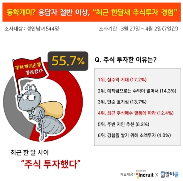 6일 취업포털 인크루트와 바로면접 알바앱 알바콜이 30대 이상 회원 544명을 대상으로 설문한 결과, 55.7%가 최근 한 달 사이에 주식 투자를 한 경험이 있는 것으로 나타났다.