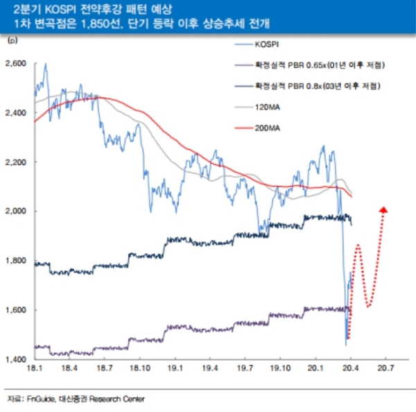 이경민 대신증권 연구원은 “정책동력, 유동성 모멘텀이 강화되면 한국 경제·기업실적 불확실성이 완화되고, 이는 2분기 증시에도 반영될 수 있다”며 “4월 중 등락 이후 상승추세로 바뀌고 상승탄력도 강화될 가능성을 높다”고 전망했다. 2분기 코스피 최고 저점과 고점을1550~2000포인트를 제시했다.