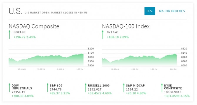스탠더드앤드푸어스(S&P)500지수는 20.25포인트(0.76%) 오른 2679.66에, 기술주 중심의 나스닥지수는 51.52포인트(0.65%) 상승한 7938.78을 각각 나타내고 있다.