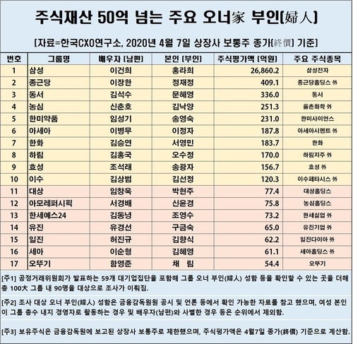기업분석 전문 한국CXO연구소는 100대 그룹 재벌가 부인 주식재산 현황을 분석한 결과를 발표했다.