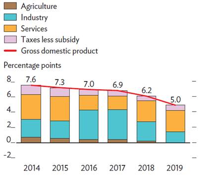 ADB는 2020년 4월 초 Asian Development Outlook 2020을 발간했다. 이 자료에 의하면 라오스의 경제성장률은 2018년 6.2%에서 2019년 5.0%로 하락한 것으로 나타났다. 2014년 7.6%의 경제성장률을 기록한 이후 지속적으로 성장률이 둔화되고 있다. 2019년 경제성장률 하락의 주된 요인은 자연재해에서 기인하고 있다. 홍수, 가뭄, 아프리카 돼지열병은 농업과 수력발전 사업에 엄청난 악영향을 미쳤다. 농업 분야는 2019년 라오스 GDP의 15.5%를 차지하고 있다. 2018년 농업분야 성장률은 전년 대비 1.3%였으나, 2019년에는 자연재해로 인해 0.2%를 기록했다.
