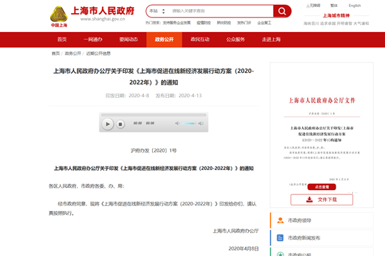 상하이시 온라인 신경제 발전촉진의 행동방안(2020~2022) 발표