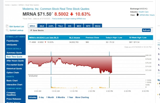 미국 뉴욕증시 나스닥 거래소 모더나 마감시세