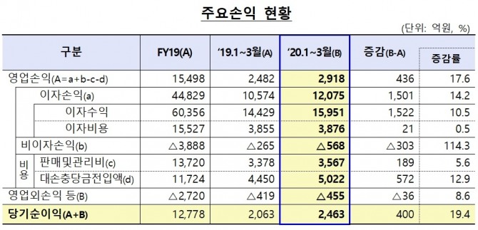 이미지 확대보기25일 금융감독원이 발표한 '2020년 1분기 저축은행 영업실적'에 따르면 저축은행의 올해 1~3월 당기순이익은 2463억 원으로 전년 동기 2063억 원에 비해 19.4%(400억 원) 늘었다.