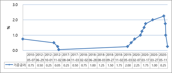 (개요) 2008년 금융위기 이후 주요국 중앙은행은 위기상황에서의 경기부양을 위해 기준금리의 조정 외에도 시중에 직접적으로 유동성을 제공하는 양적완화(Quantitative Easing, QE) 정책을 사용했던 적이 있다. 체코 중앙은행은 코로나19로 인한 현 상황 속에서 별도의 양적완화 조치를 시행하기 보다는 기준금리 인하 조치를 시행하여 경기회복을 견인하는 정책을 시행하고 있다. 국가비상사태선포(3월 12일) 이후 체코 중앙은행(CNB)은 경기부양을 위해 기준금리(key repo rate)를 3개월 동안 3차례*에 걸쳐 총 2.00%p를 인하하여 5월말 현재 0.25% 수준으로 운영하고 있다. 이처럼 단기간에 금리를 급격히 인하한 이유는 자산가격, 기대심리 등을 회복하고, 소비 및 설비투자를 진작시켜 침체된 체코경기를 부양하고자 하기 위함이다. 0.25% 금리 수준은 2012년 11월 재정위기 수준(0.05%) 다음으로 낮은 수치임을 감안할 때, 중앙은행은 현 상황을 경제위기로 간주하고 있다고 볼 수 있다.