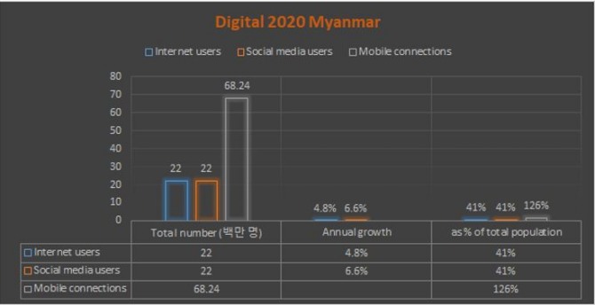2012년 이후 미얀마의 인터넷 사용율은 1.8%에 불과했으나 2015년에는 21.8%, 2020년 1월에는 40%를 넘어섰다. 미얀마에서 인터넷을 이용하는 인구는 2,200만 명으로, 타 동남아 국가 대비 많은 편이다. 최근 스마트폰 보급률의 증가, 저렴한 데이터 요금제, 모바일 인프라 확대로 인터넷 보급이 계속 증가하고 있으며 SNS 사용자도 점점 증가하고 있다. 미얀마 전체 인터넷 사용의 85% 이상을 페이스북이 사용하고 있으며, 페이스북을 통한 물건 구입에 사람들이 익숙해지면서 온라인 쇼핑에 대한 소비자들의 관심이 높아졌다. 여기에 2020년 발생한 코로나19 사태로 인하여 오프라인 쇼핑이 사실상 중단되면서, 미얀마 온라인 쇼핑 시장의 성장 가능성이 그 어느 때보다도 커지고 있다.