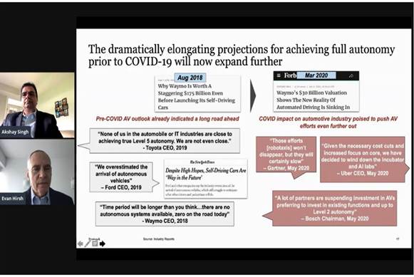 미래 자동차 기술 구현의 핵심 기반인 자율주행차(AV)의 개발과 5G(5세대 이동통신) 기술이 들어간 커넥티드카(인터넷 통신과 연결된 자동차) 즉 '5G 커넥티드 자동차'의 런칭도 늦춰질 것으로 전망됐다. 하지만 5G커넥티드카 관련 투자는 계속될 것이라고 글로벌 시장조사업 IHS MARKIT의 Jeremy Carlson 자율주행분야 분석팀장 등 연사들은 전했다.