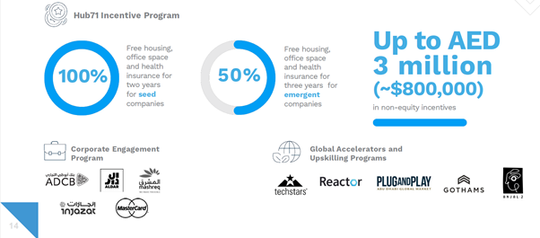 Hub71의 인센티브 프로그램은 시드 단계 기업에 최장 2년간 최대 5인의 주택, 사무공간, 건강보험을 무료로 제공한다. 신생 기업(emergent companies)에겐 최장 3년간 최대 25인의 주택, 사무공간 및 건강보험을 50%의 비용으로 제공한다. Hub71의 웹사이트(Hub71.com)를 통해 온라인으로 신청 가능하다. 주요 투자 분야는 이커머스, 핀테크, 소프트웨어, 인공지능∙빅데이터∙분석이며, UAE 스타트업이 가장 많고 미국, 영국의 스타트업이 그 뒤를 잇고 있다. 현재 총 51개 스타트업을 지원하고 있으며 6월 말 무렵까지 60~65개 사를 지원할 예정이다.