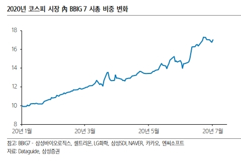 삼성증권에 따르면, 코스피에서 BBIG 7 기업들이 차지하는 비중은 17% 수준까지 상승했다.