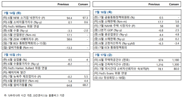 미국 중심 지표 개선세는 당분간 계속될 전망이다. 6월 소매판매, 소비자물가 시장추정치(컨센서스)는 전월 대비 회복세에 무게를 두고 있다.