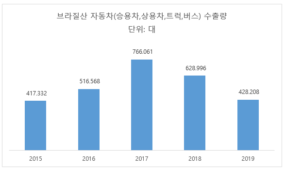 2019년 브라질에서 생산된 자동차(승용차,상용차,트럭,버스) 수출량은 42만 8200대로 전년대비 31.9% 감소했으며 수출액은 97억 7000만 달러 기록, 전년대비 32.6% 감소한 것으로 드러났다.