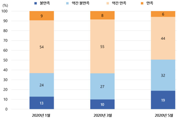노무라종합연구소(NRI)의 조사 결과에 의하면 코로나19로 인한 사회적 거리 두기, 외출 및 이동 자제 등으로 인해 일본인들의 일상생활에 대한 만족도가 전반적으로 낮아졌다고 한다. 일본 정부의 전국적인 긴급사태 선언이 지속되고 있던 2020년 5월에는 자신의 생활에 만족하고 있지 못하다고 응답한 사람의 비율이 51%를 기록하며, 과반수를 넘어섰다. 이는 2020년 1월 및 3월의 비율(각 37%)과 비교했을 때 대폭 증가한 수치이다.