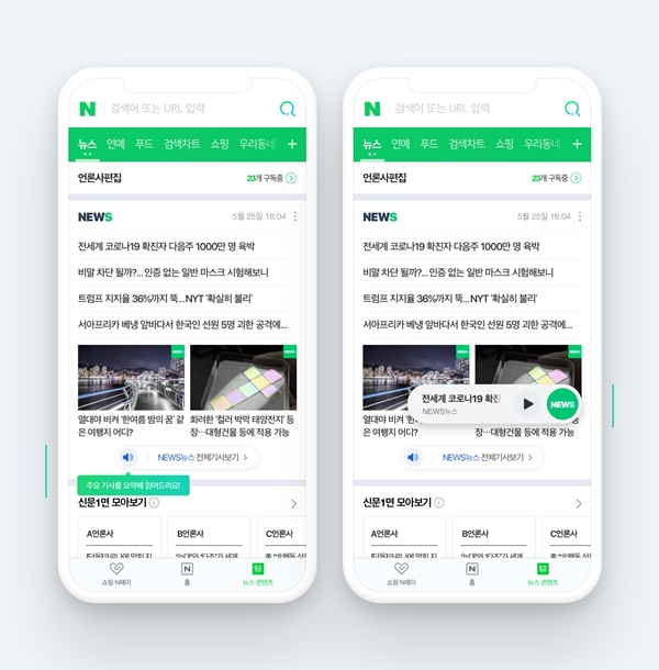 이미지 확대보기네이버는 31일 모바일 네이버 앱 뉴스홈에서 이 서비스를 선보인다고 밝혔다. 이용자는 구독 중인 언론사 편집판 하단의 재생 버튼을 눌러 현재 배열된 기사 요약문을 음성으로 들을 수 있다.