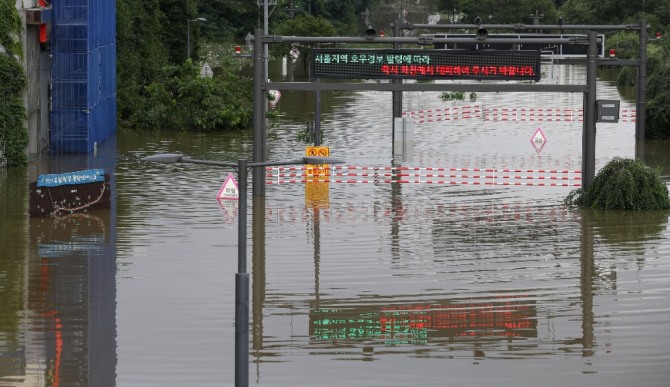 지난 6일 서울 양천구 신정교 인근 도림천이 수위가 높아져 시설물들이 잠겨 있는 가운데 전광판에 호우경보 관련 하천 대피 안내가 나오고 있다. 사진=뉴시스