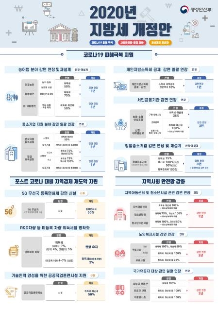 또 코로나19로 어려움을 겪는 농·어업 분야 지원을 위해 취득세와 재산세 감면이 연장되는 내용과, 5G 무선국 등록면허세 감면 등 '디지털 뉴딜'과 '그린 뉴딜' 사업을 위한 세제 혜택 등의 내용도 담겼다.