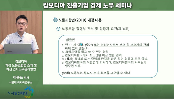 캄보디아 개정 노동조합법 및 최신 인사노무관리 방안 발표 화면