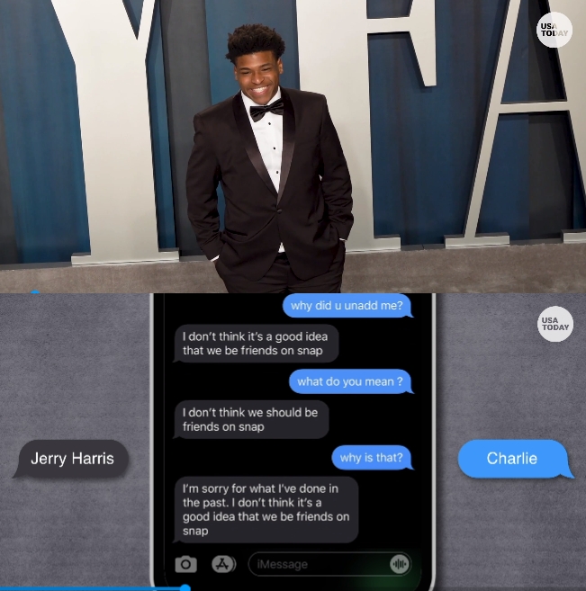 피해자인 쌍둥이 형제 찰리와 샘 가족은 USA투데이에 5개의 텍스트 스크린 샷과 그들이 해리스 계정이라고 말하는 소셜 미디어에 올린 소년과의 대화를 제공했다. 일부 메시지에는 누드 사진이나 성별을 명시적으로 요청하는 메시지가 포함된다. 해당 사진에는 스냅챗의 한 대화에서 ".jerry harris"라는 이름의 계정이 쌍둥이 형제 중 찰리가 머리 위로 다리를 뻗는 사진에 응답하는 내용이 들어 있다.