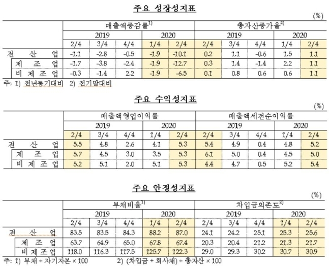 이미지 확대보기한국은행이 15일 발표한 '2020년 2분기 기업경영분석'에 따르면 4~6월 국내 외감기업의 매출액증가율은 전년동기대비 10.1% 감소해 전분기(-1.9%)보다 하락폭이 커졌다.