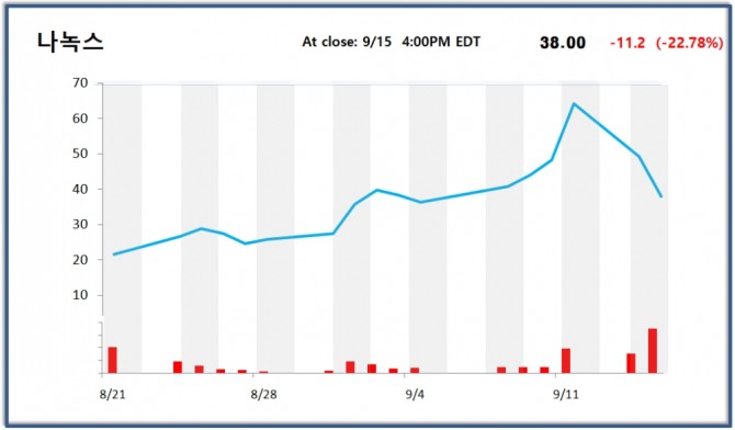 이미지 확대보기15일(뉴욕 현지시각) 뉴욕 증시에서 벤처기업 나녹스는 전 거래일 대비 22.78% 하락한 38.00 달러에 장을 마감했다.