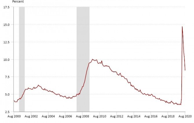 코로나19로 직격탄을 맞은 미국 일자리 시장은 지난 5월 미국의 경제 재개와 함께 회복세를 이어가고 있다. 2019년 1월부터 코로나19가 팬데믹으로 확산되기 전인 올해 2월까지 4% 미만을 유지했던 미국의 실업률은 지난 4월 14.7% 치솟았다가 다시 하락해 8월 8.4%를 기록했다. 팬데믹 이후 처음으로 10% 아래로 떨어졌다. 비농업부문 일자리수도 전월보다 137만 개 증가한 1억4000만 개로 집계됐다.