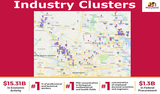 현재 전 세계적으로 의약 및 의료 분야 대한 수요와 성장이 커지고 있다. 메릴랜드주 또한 ‘Bio Health Capital Region(BHCR)’라는 주제로 2023년까지 미국 3대 제약·바이오 클러스터로 도약하겠다는 꿈을 가지고 있다. 워싱턴D.C와 메릴랜드주를 중심으로 형성된 ‘생명과학 지역’은 국립보건원(NIH), 식품의약국(FDA), 국립암센터 등 70여 개 이상의 연방기관, 국립 연구소와 자연과학 연구대학교로 유명한 존스 홉킨스 대학 및 메릴랜드 대학 등이 있으며, 교육과 투자가 동시에 이뤄질 수 있다는 장점이 있다. 메릴랜드 BHCR 클러스터는 150억 달러 규모의 경제적 가치와 13억 달러의 정부 조달 사업이 이행되고 있으며, 미국 전역 중 가장 많은 의료 관련 종사자 및 박사급 학위 소지자가 포진해 있다.