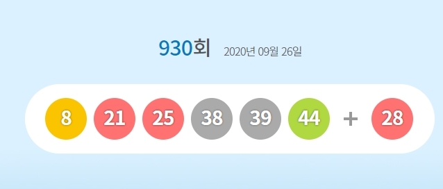 930회 로또 당첨번호 8·21·25·38·39·44…보너스 번호 28