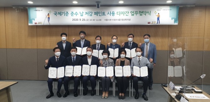 이미지 확대보기25일 서울시청 신청사에서 열린 '국제기준 준수 납 저감 페인트 사용 다자간 업무협약식'에서 삼화페인트를 포함한 삼화페인트를 비롯한 KCC, 강남제비스코, 노루페인트, 조광페인트 등 도료 제조 5개사와 한국페인트잉크공업협동조합은 서울시, 서울시설공단, 서울주택도시공사(SH), 녹색서울시민위원회와 납 저감 페인트 제조와 사용에 따른 유해물질로부터 안전한 서울을 조성하기로 했다.
