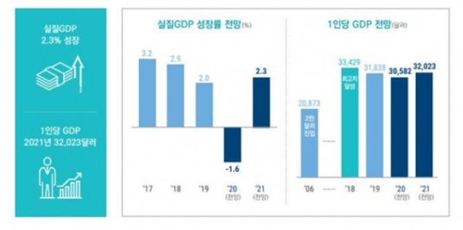 1인당GDP는 내년 3만2023달러로 늘어나지만 2018년의 3만3429달러에 미치지 못할 것으로 예상됐다.