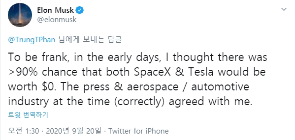 2일(현지시간) CNBC에 따르면 머스크 테슬라 최고경영자(CEO)는 최근 올린 트윗에서 “(테슬라와 스페이스X) 창업 초기에는 테슬라와 스페이스X의 기업 가치가 빵(0)이 될 가능성이 90% 이상이라고 봤다”며 이같이 밝혔다. 그럼에도 그는 수백만달러의 자금을 두 회사에 과감히 투자했다는 얘기.