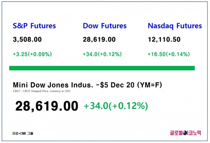 스탠더드 앤드 푸어스(S&P) 500 지수 선물은 0.09%(3.25포인트) 상승한 3508포인트에 거래되고 있고, 나스닥 100 선물은 0.14%(16.5포인트)상승한 1만2110.5포인트에 거래되고 있다.