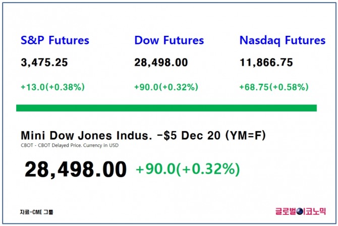 스탠더드 앤드 푸어스(S&P) 500 지수 선물은 0.38%(13포인트) 상승한 3475.25에 거래되고 있고, 나스닥 100 선물은 0.58%(68.75포인트)상승한 1만1866.75에 거래되고 있다.