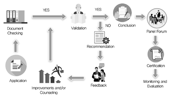신청 기업은 자체평가서(Self-assessment)를 작성하고 기업의 구조, 표준운영과정에 대한 기술, 사무실・공장・창고 등 정보, 전년도 기준의 감사보고서 사본, 공급망에 대한 목록 및 연락처 등의 정보를 포함한 AEO 필요서류를 확인해 제출해야 한다. 이후 세관에서 서류심사(Document Checking)를 수행하고 현장심사(Validation)를 통해 점검한다. 현장심사를 충족시키지 못할 경우에 권고사항을 기업에 피드백해 기업이 보완토록 하고 재심사를 충족할 경우 패널포럼을 거쳐 AEO를 부여하게 된다.