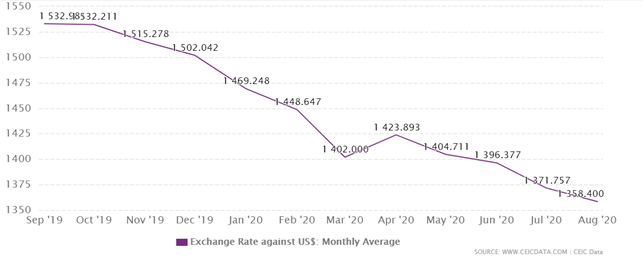 미얀마에서는 현재 지속적인 환율 하락 현상이 나타나고 있다. 2019년 9월 1달러당 1,532 차트를 기록하던 달러화 환율은 2020년 9월 1,300차트 대로 감소하며 1년 사이 15%가 하락하였다. 2020년 10월 15일 현재 미얀마 중앙은행(Central Bank of Myanmar; CBM) 고시환율은 1 달러에 1,303.3차트를 기록하고 있다. 달러화가 강세를 보이고 있는 글로벌 시장의 상황과는 달리 미얀마의 환율은 오히려 지속적으로 하락하며 탈동조화(decoupling) 현상을 보이고 있다.