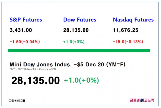 이미지 확대보기스탠더드 앤드 푸어스(S&P) 500 지수 선물은 0.04%(1.5포인트) 하락한 3431포인트에 거래되고 있고, 나스닥 100 선물은 0.13%(15포인트)하락한 1만1676.25포인트에 거래되고 있다.