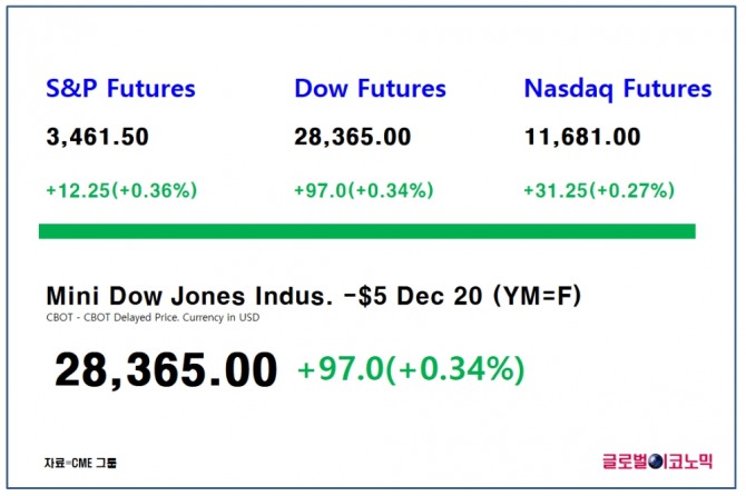 스탠더드 앤드 푸어스(S&P) 500 지수 선물은 0.36%(12.25포인트) 상승한 3461.5포인트에 거래되고 있고, 나스닥 100 선물은 0.27%(31.25포인트)상승한 1만1681포인트에 거래되고 있다.