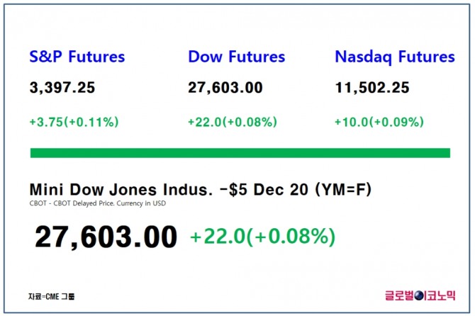 이미지 확대보기스탠더드 앤드 푸어스(S&P) 500 지수 선물은 0.11%(3.75포인트) 상승한 3397.25포인트에 거래되고 있고, 나스닥 100 선물은 0.09%(10포인트)상승한 1만1502.25포인트에 거래되고 있다.
