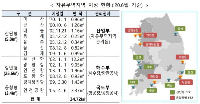 현재 국내에는 산단형(7곳), 항만형(5곳), 공항형(1곳) 등 13곳을 지정해 운영하고 있다. 1970년 제도 도입 이후 1990년대까지 전체 수출의 2~4%를 차지하는 등 우리나라 수출 1000억 달러 달성에 기여한 것으로 평가 받았다.