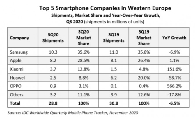 샤오미는 화웨이를 제치고 3위에 올랐다. 12.8%의 점유율로 370만 대를 출하했다. 전년 동기 150만 대 출하와 4.8% 점유율에 그쳤지만, 무려 8%포인트(p) 높아진 것이다. 연간 성장으로는 151.6% 증가다.
