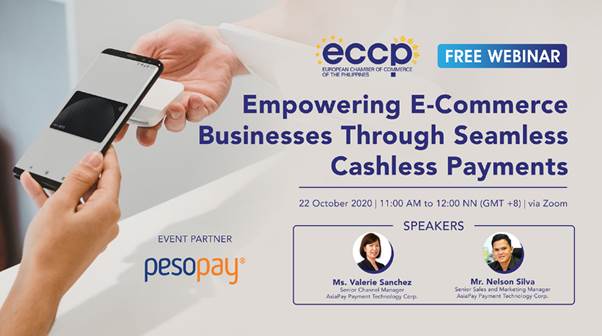 2020년 10월 22일 주필 유럽상공회의소(ECCP)는 Asiapay 연사를 초청해 코로나19 기간에 급증한 전자상거래 수요에 맞춰 비현금 결제 수단 도입에 대해 안내하는 웨비나를 개최했다. 해당 웨비나를 통해 코로나19가 필리핀 기업 및 고객에게 미치는 영향과 비현금 결제 도입 시 주요 고려사항 등을 확인할 수 있었다. 또한, Asiapay 관계자는 비현금 결제 수단 도입을 통해 기업은 매출 증대, 프로모션 유치, 고객 유치, 비즈니스 환경 개선 등의 효과를 누릴 수 있다고 설명했다.