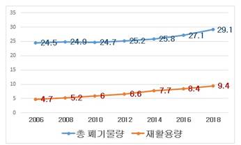 위 도표에서 볼 수 있듯이, EU 내 발생하는 폐기물량은 지난 15년간 지속적으로 증가추세를 보이고 있다. 이와 더불어 재활용 비중 역시 완만한 증가세를 보이고 있으나, 연간 발생하는 총량에 비하면 여전히 상당히 낮은 수준에 불과하다.