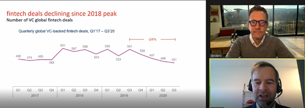 2020년 핀테크 산업은 투자자와 창업자 모두에게 긍정적인 한 해였다고 한다. 웨비나에 따르면, 2017년 이후 핀테크 산업의 분기별 벤처캐피털 투자유치 규모는 일정한 수준을 유지하고 있으며 코로나19에도 핀테크 벤처캐피털 투자는 영향 받지 않은 것으로 나타났다. 코로나19로 전자상거래 분야를 비롯한 다양한 산업의 디지털화는 오히려 가속화돼 핀테크 산업에 긍정적인 영향을 미친 것으로 나타났다.