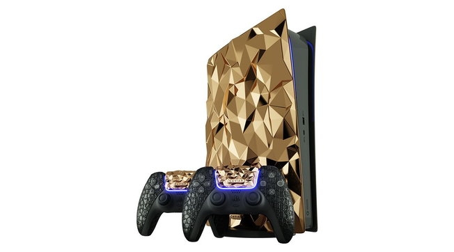 공개된 사진에는 기존의 슬림하면서도 현대적 디자인을 갖춘 PS5 본체는 금광의 암석을 연상시키는 등 형이상학적 모습으로 탈바꿈했다. 밋밋했던 컨트롤러도 금코팅과 악어가죽이 어우러지면서 고급스럽게 재디자인됐다.