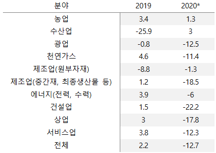 2020년은 농업 및 수산업만 플러스 성장 예상