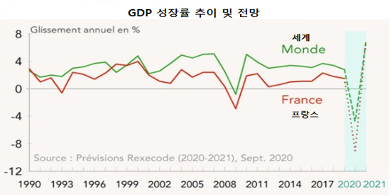 프랑스 중앙은행은 2020년 프랑스 GDP 성장률이 -9%에 이를 것으로 전망했다. 프랑스 경제는 2020년 3월~5월 코로나19 확산에 따른 첫 번째 전국봉쇄조치로 역사적인 침체를 겪었으나, 봉쇄해제 이후 3분기에 크게 반등(3분기 GDP 성장률 +18%)할 수 있었다.하지만 최근 4분기 들어 바이러스의 2차 확산과 두 번째 봉쇄조치로 다시 한번 침체기(-4%)를 경험하게 되었다. 다행히 11월 말 상점 영업이 허용되고 연말 소비가 증폭되면서 10월에 시작된 두 번째 봉쇄조치의 여파는 상반기에 비해 양호한 수준에 머물렀다.