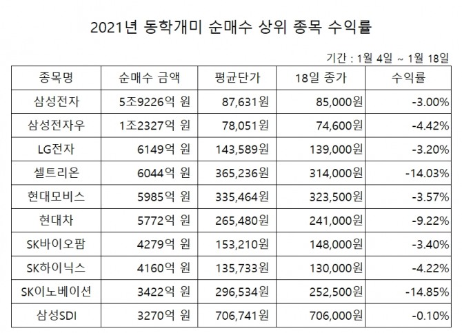 동학개미들이 올해 가장 많은 순매수를 기록한 종목은 삼성전자 보통주와 우선주로 삼성전자만 7조 원 넘게 사들였다.