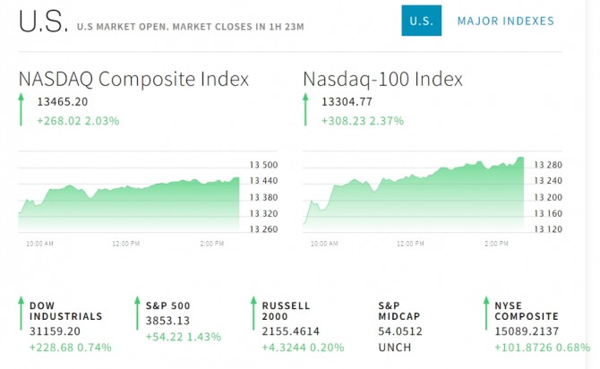 Nasdaq-100 Index 13304.77 +308.23 2.37% DOW INDUSTRIALS 31159.20 +228.68 0.74%