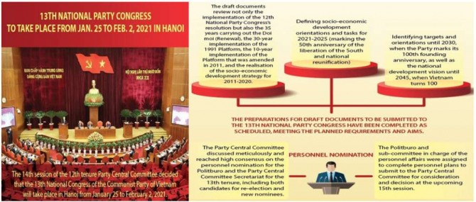 베트남은 전당대회 개최 전까지 전국에서 약 1600명의 대의원을 선출하고 200명으로 중앙집행위원회를 구성한 이후, 이 가운데 약 17~19명을 정치국 위원으로, 12~14명으로 서기국 위원을 선출한다. 일부 인원의 경우 정치국과 서기국 모두에 포함될 수 있다. 이후 정치국원의 투표를 통해 전당대회 기간 중 당 서기장을 선출 하며, 나머지 3개 보직에 대해서는 지명 후 상반기에 개최되는 국회에서 인준한다. 현재 각 지방 시성의 당 위원에서 전당대회에 참가할 1600여명의 대의원 선출은 완료된 상태이다.