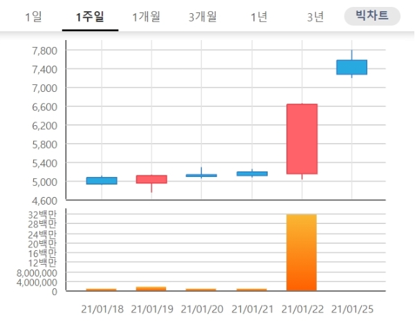 주가는 종가기준으로 20일 5080원에서 22일 6640원으로 뛰었다.