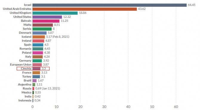 2021년 2월 7일 기준 총 34만9,696회분(도즈)의 백신이 접종됐으며, 2월 첫째 주 일일 평균(주말 제외) 약 1만4,000회분의 백신접종이 시행됐다. 현재 체코 인구의 100명당 3.3건의 백신이 투여됐으며, 이는 EU 평균보다 약간 낮은 수준이다.