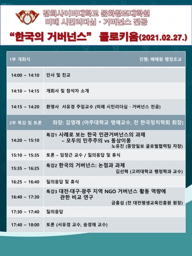 경희사이버대학교 문화창조대학원 미래 시민리더십·거버넌스 전공은 오는 27일 “한국의 거버넌스” 콜로키움을 진행한다고 23일 밝혔다.